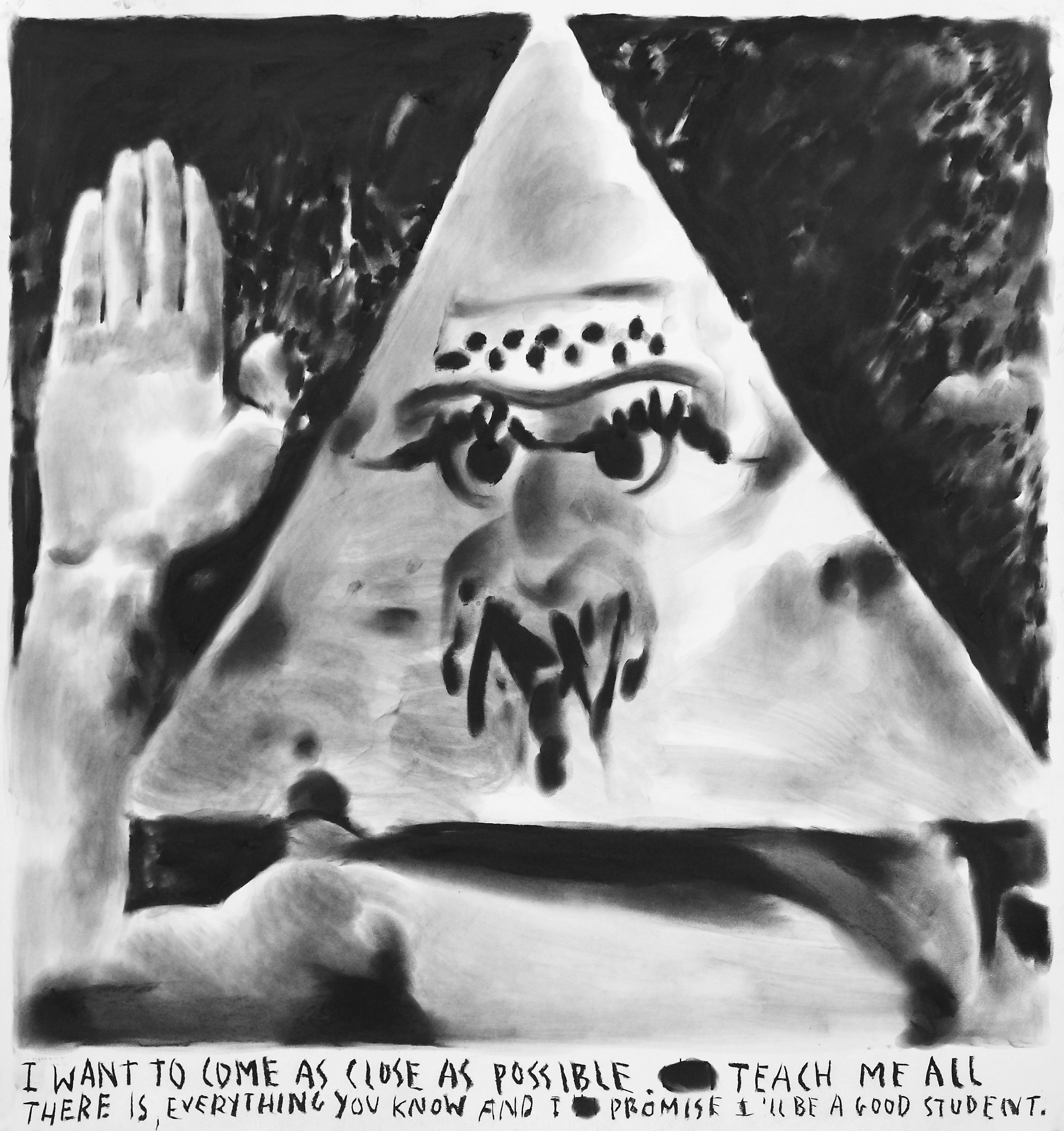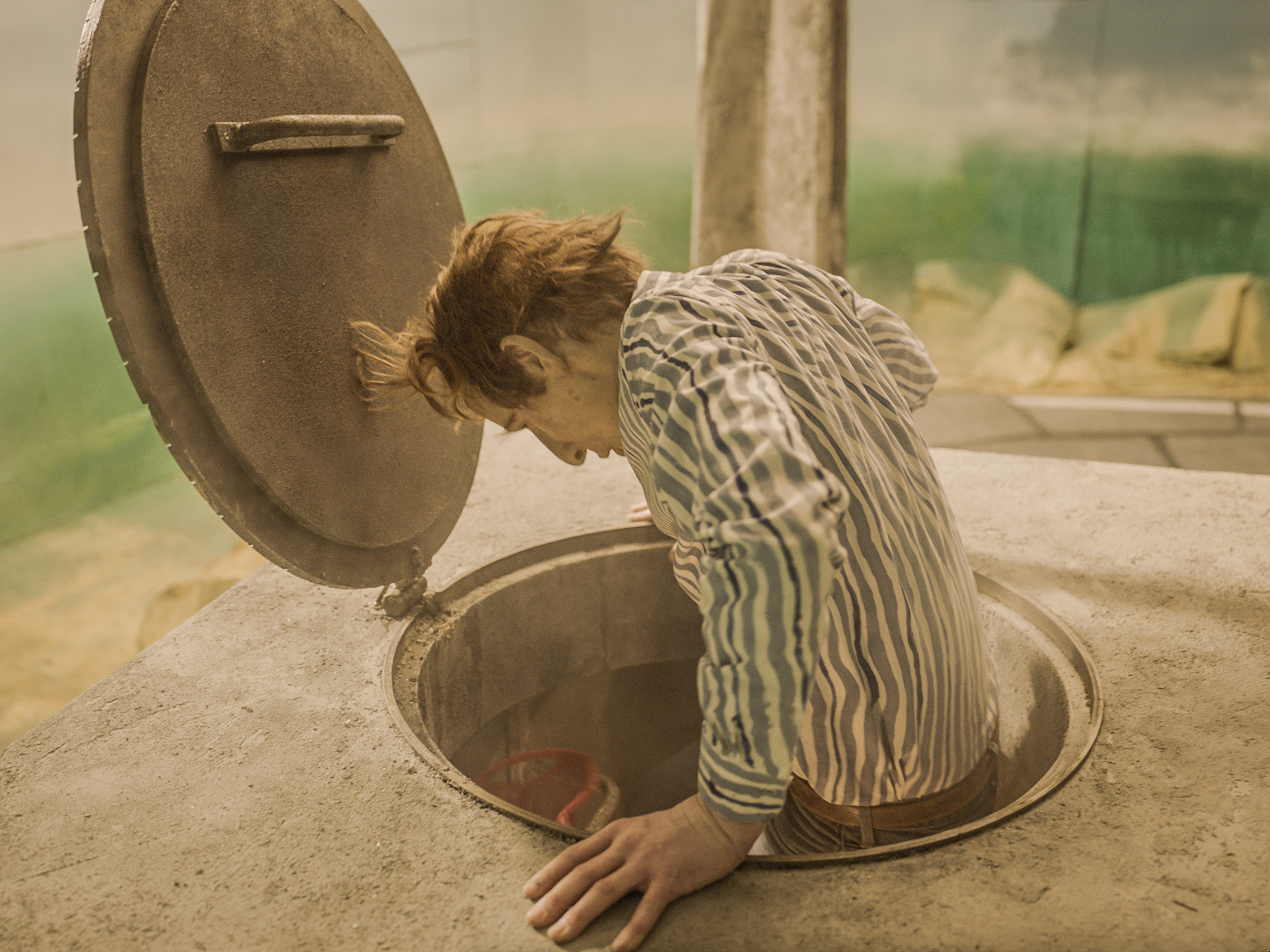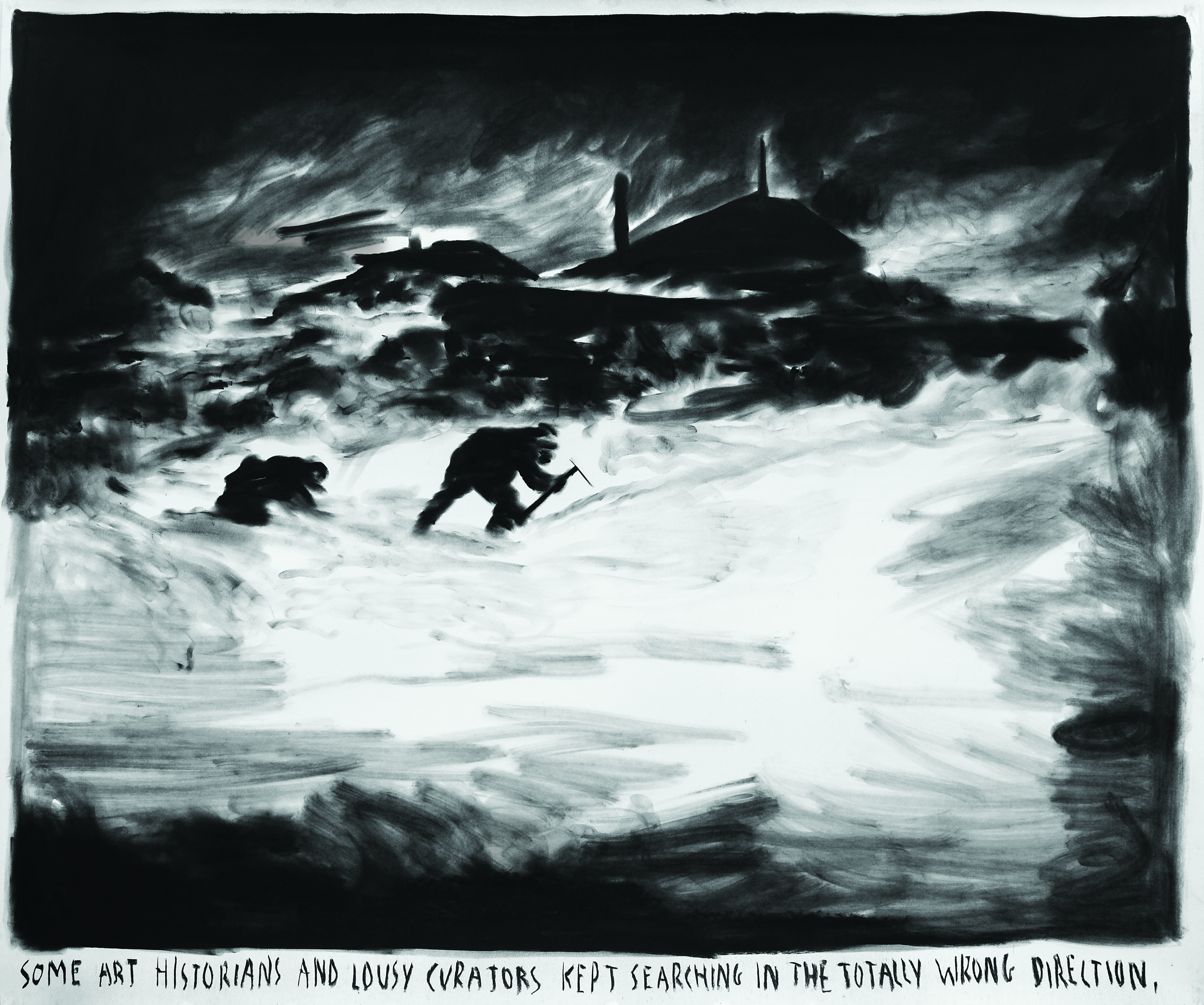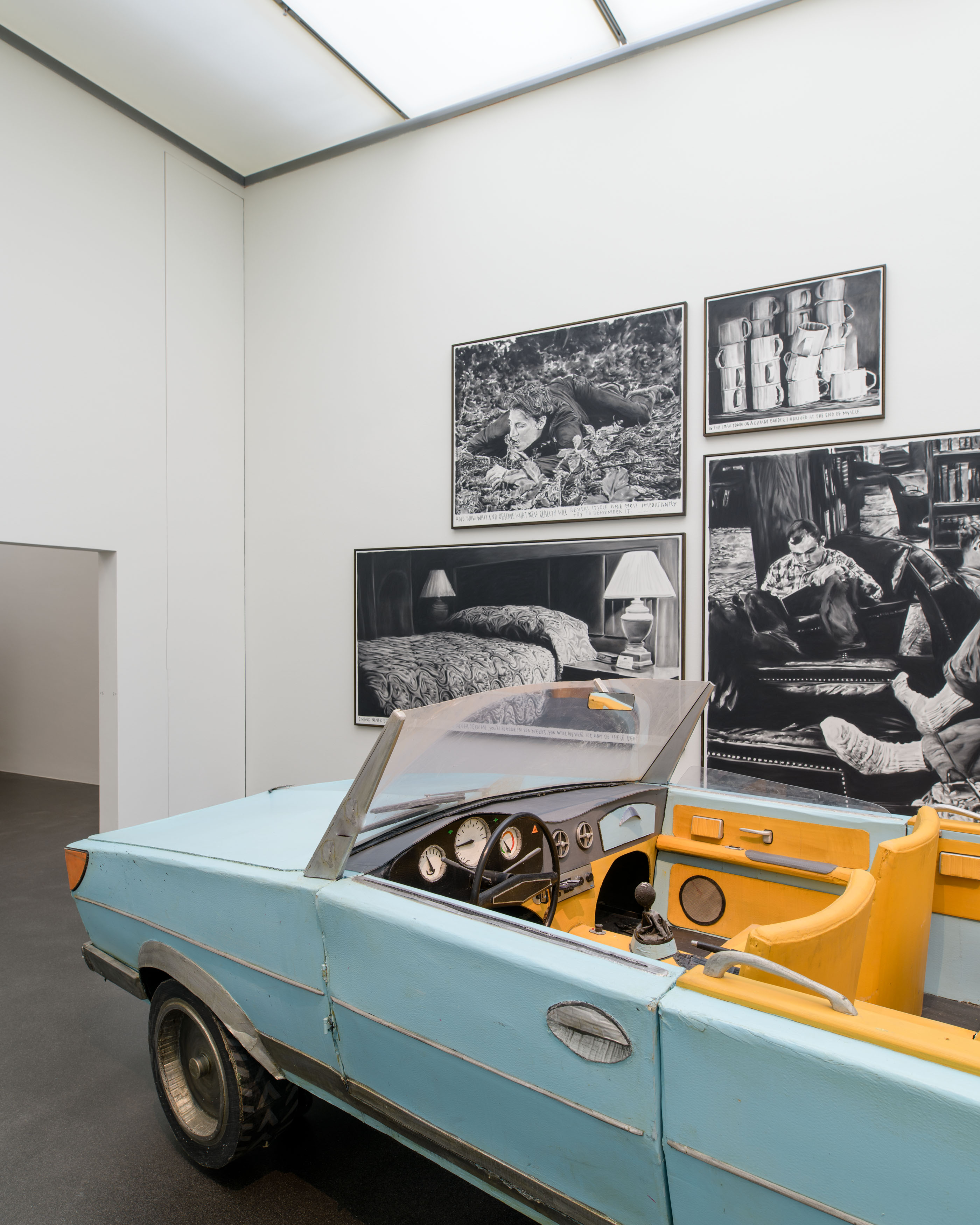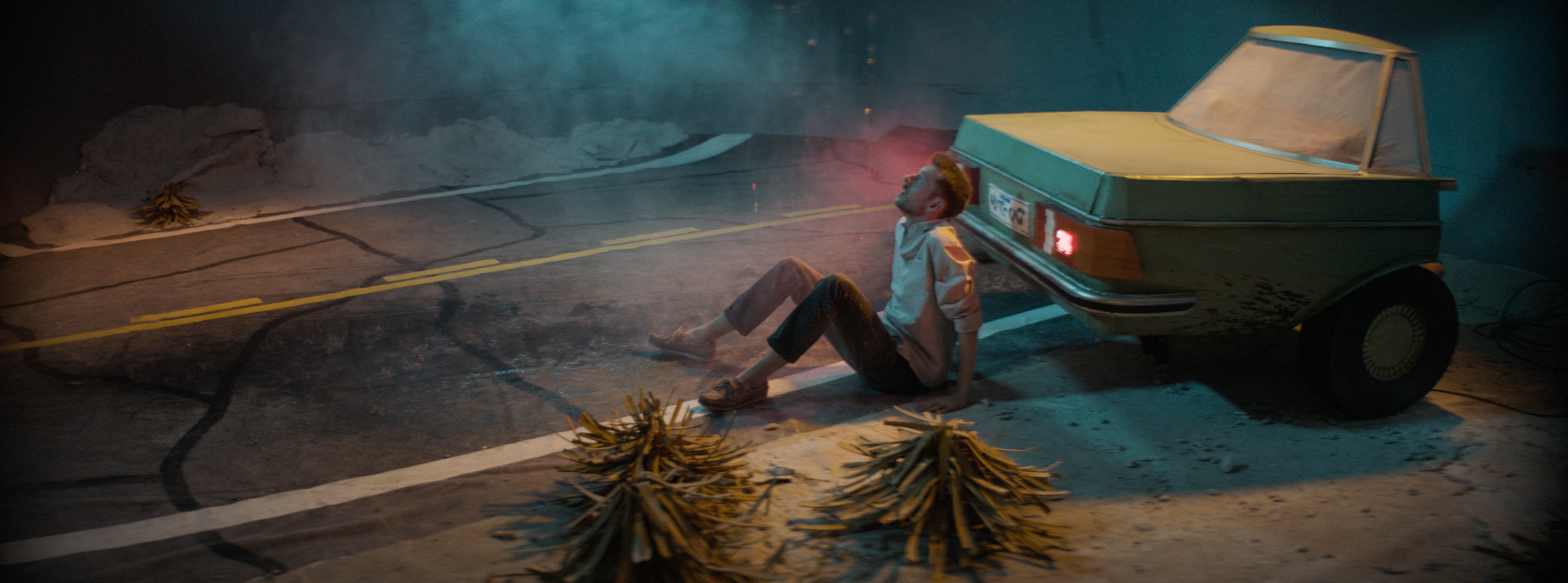 While his heroes are on the road, driving a cabriolet across the Alps, through a tunnel into the sea, caught in a downpour at a fork in the road or alone in the woods with a whole piglet roasting over a fire, Rinus Van de Velde (*1983) prefers to