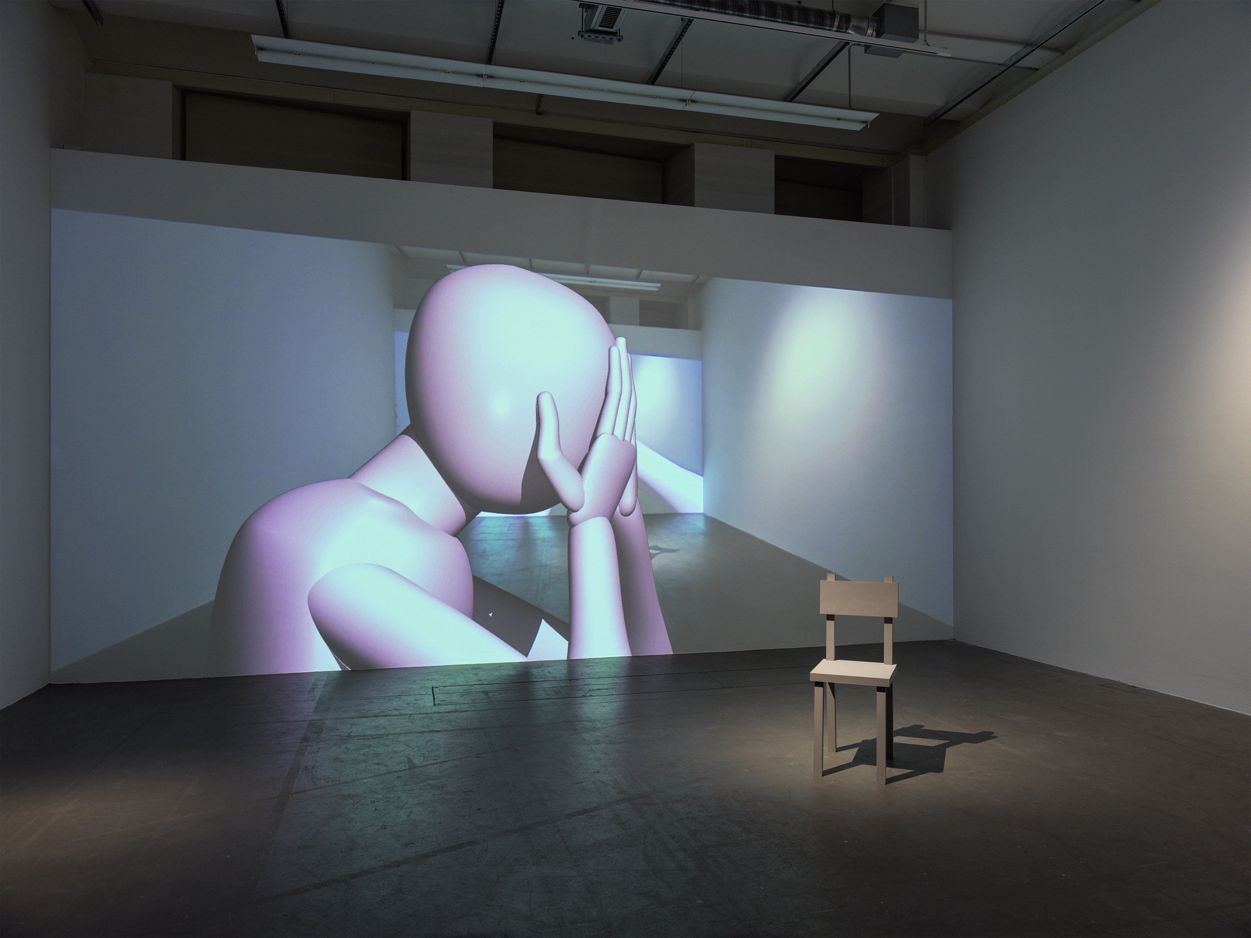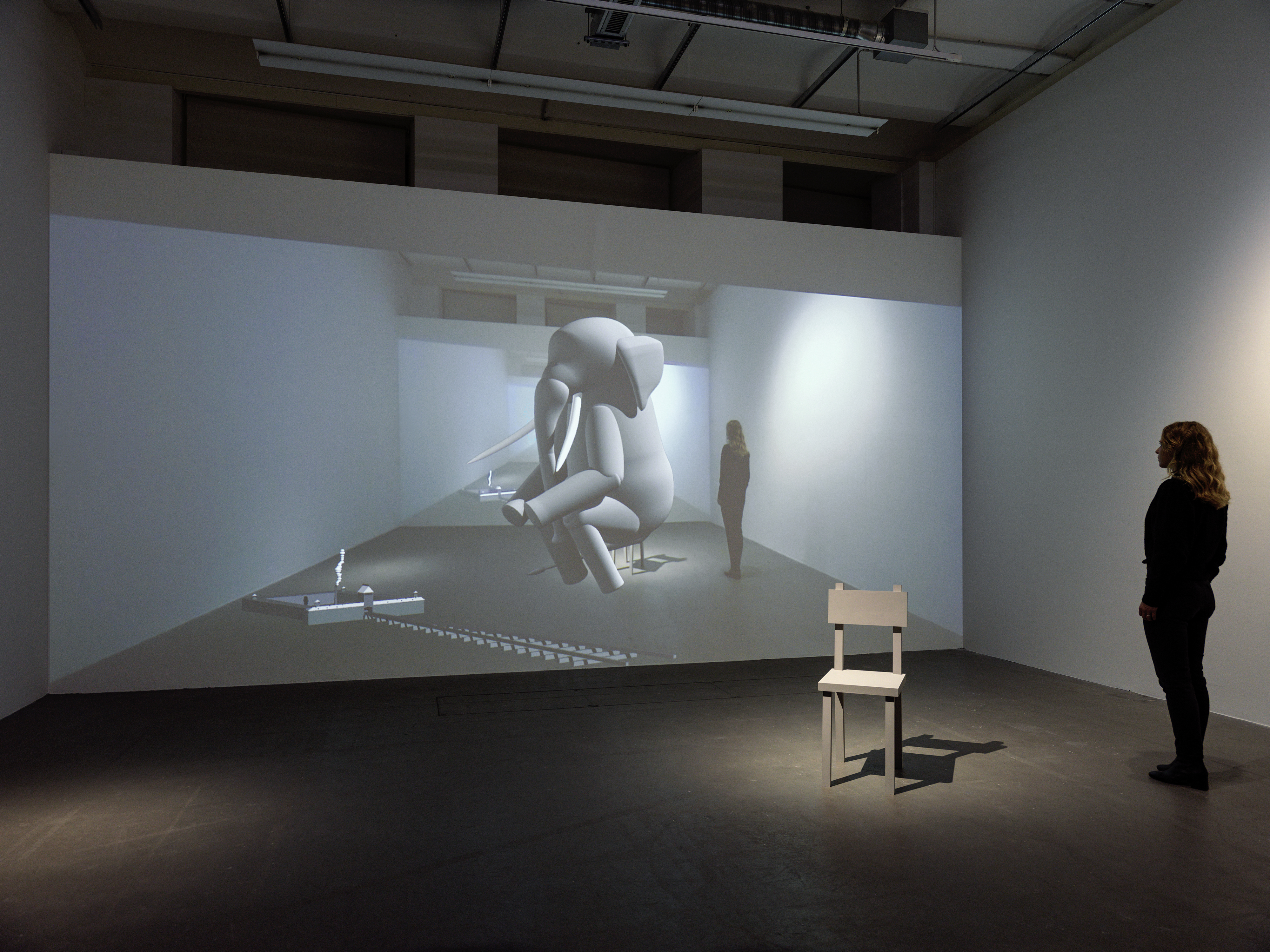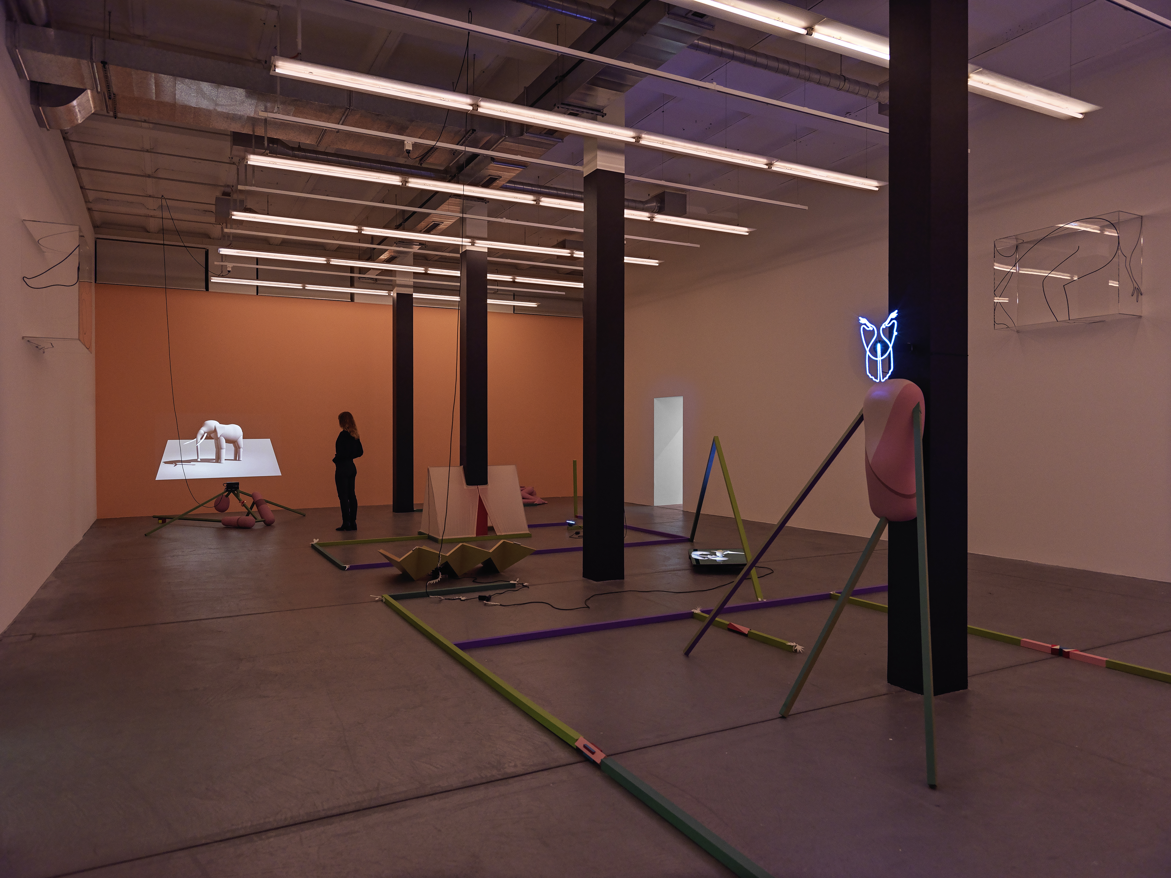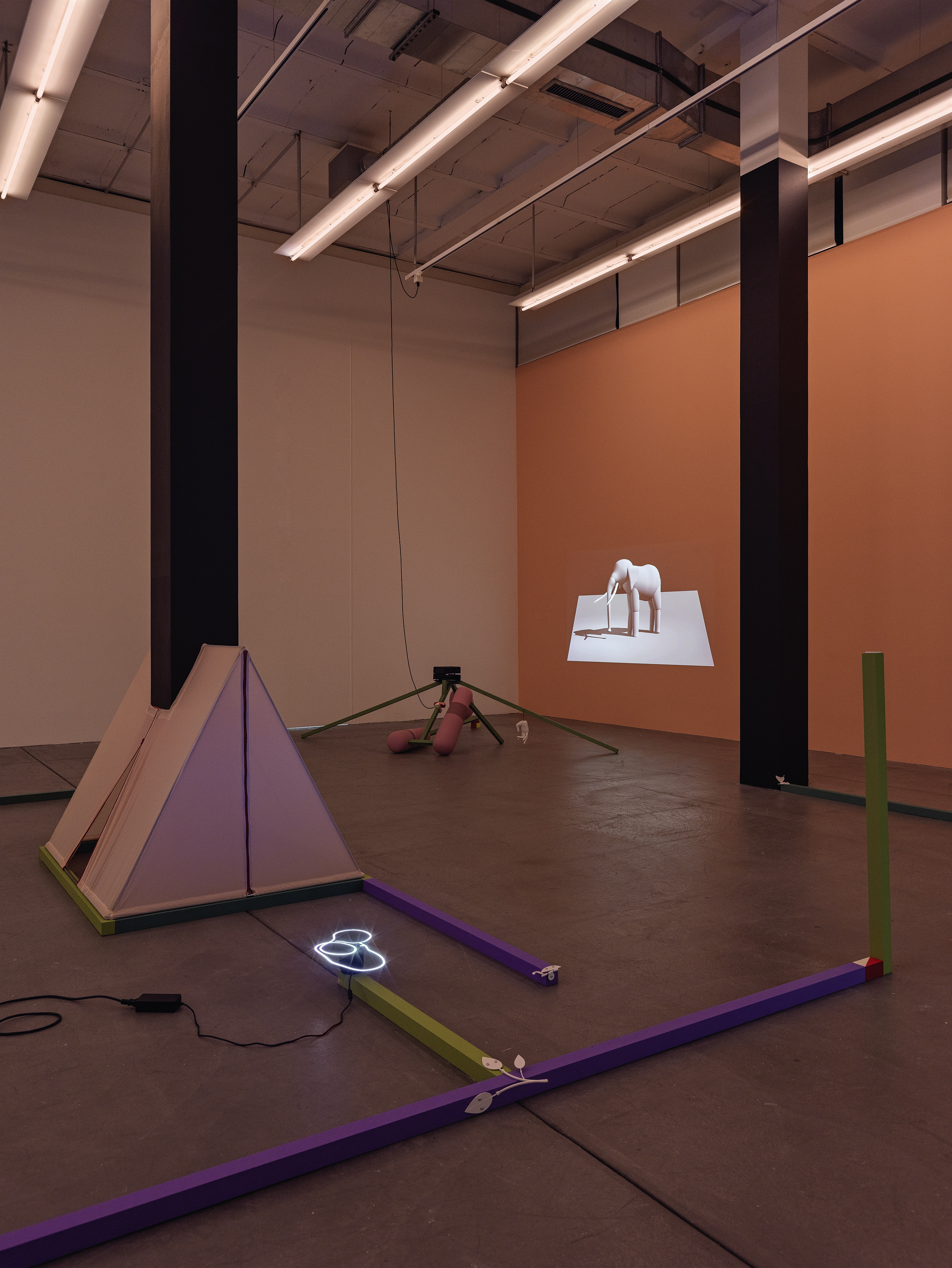 Yves Netzhammer, Zwei kühle Zwergelefanten fressen Einfühlungsüberschuss mit Pfirsicharoma, 2022. Mehrteilige Rauminstallation. Foto: Stefan Altenburger