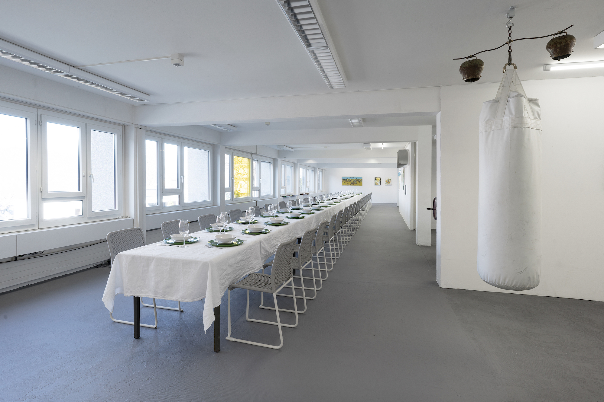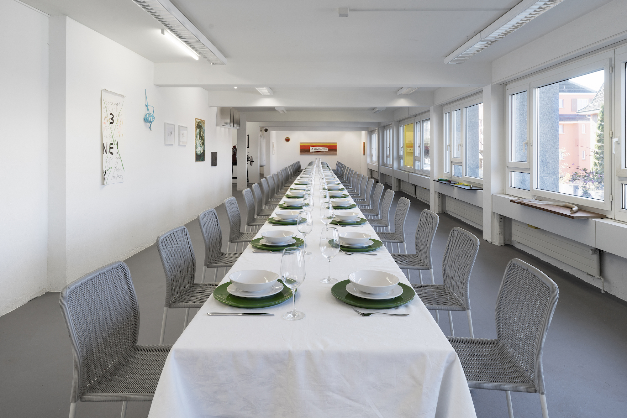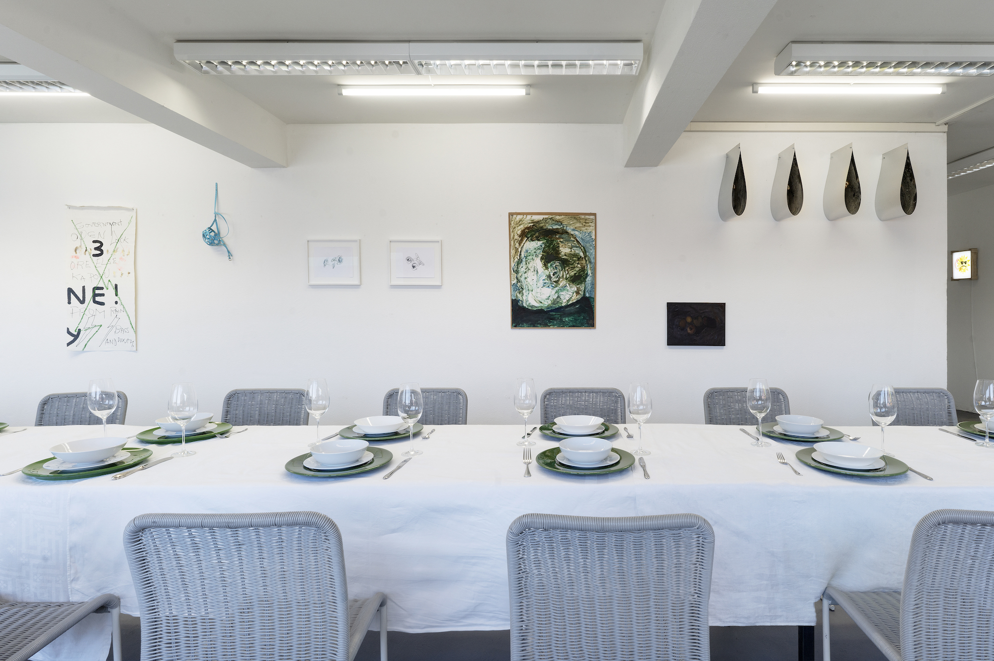 Spring Equinox is a group show with works by Swiss and international artists, ceremoniously installed around a long banquet table.