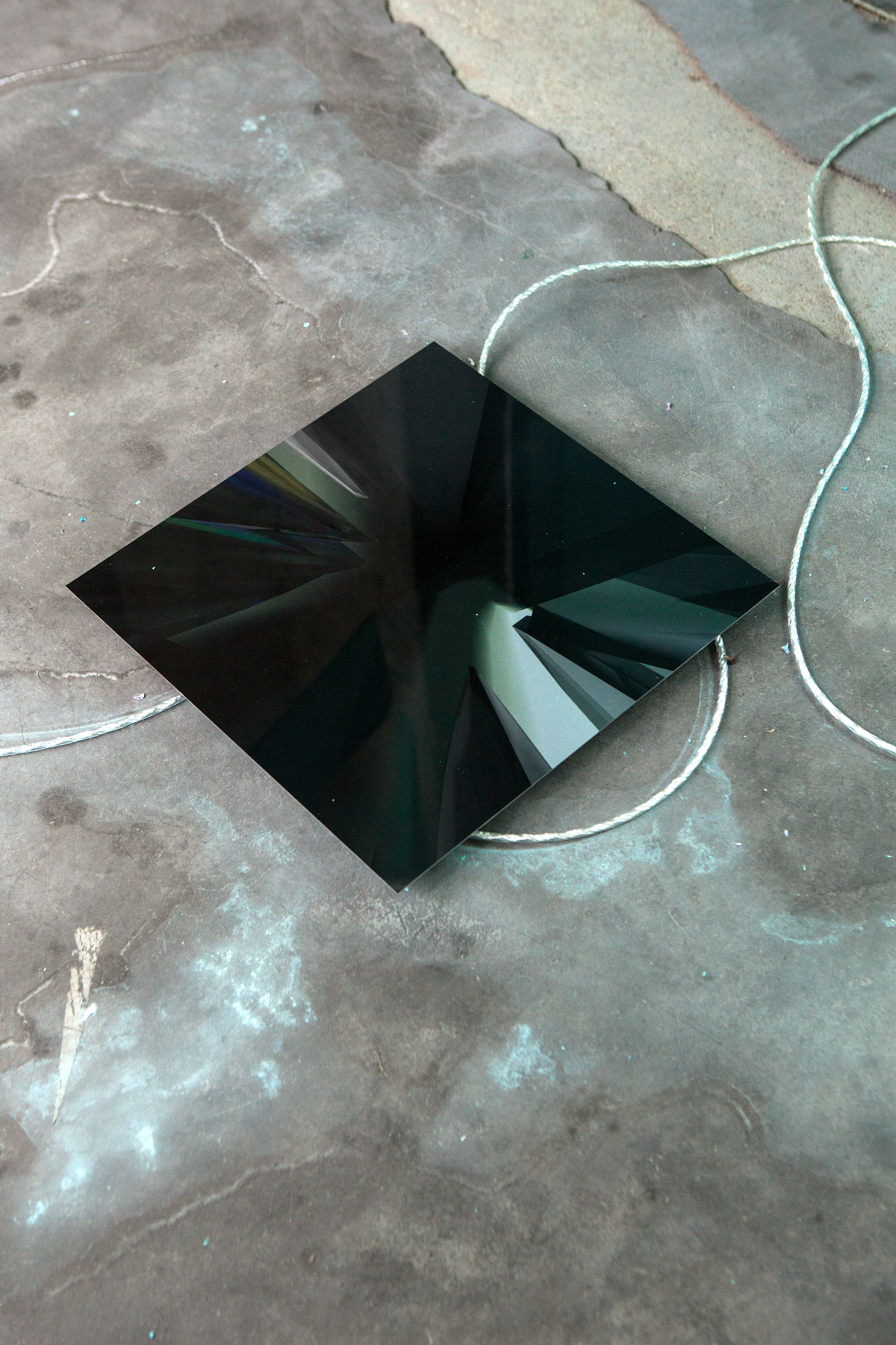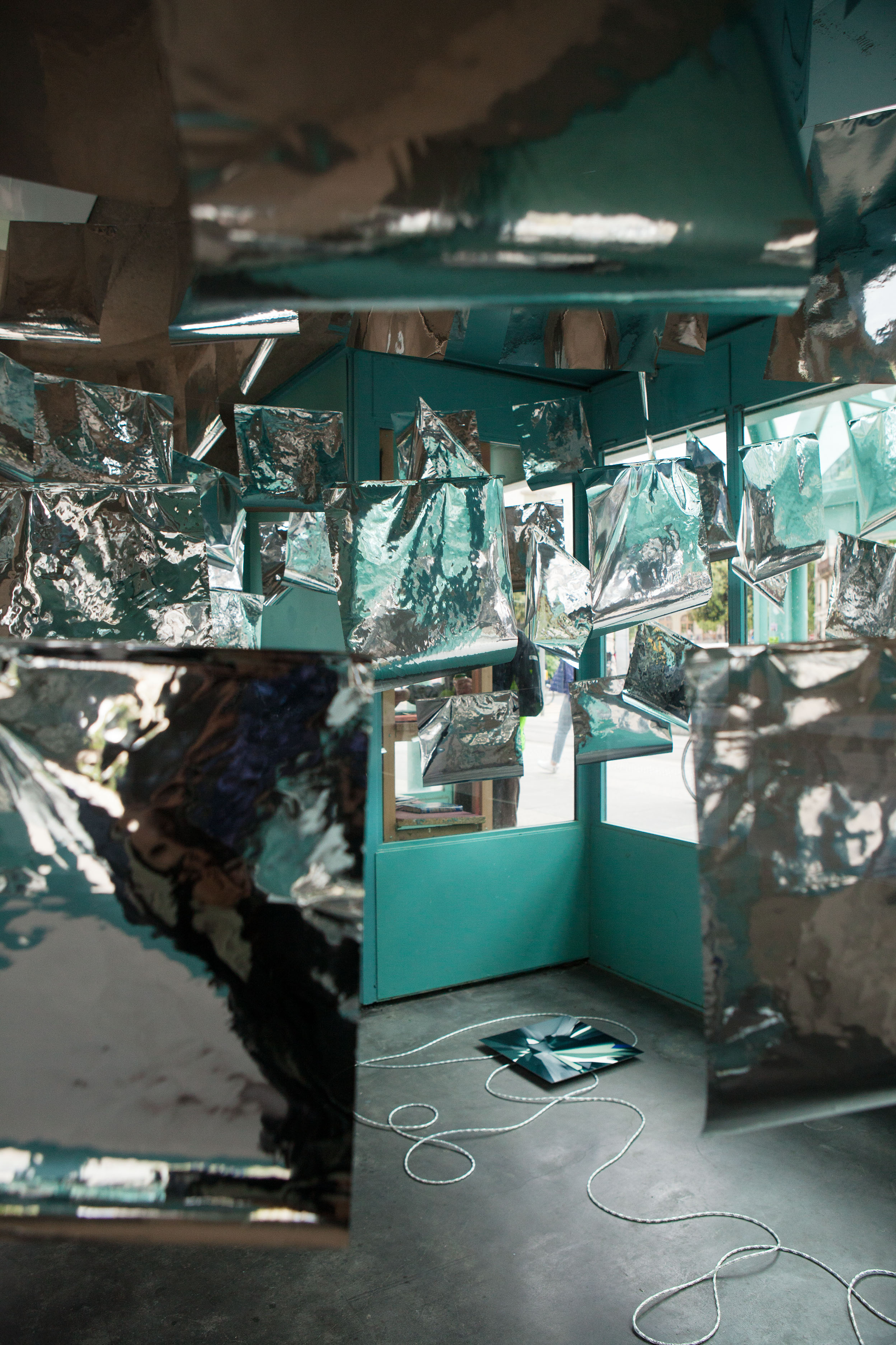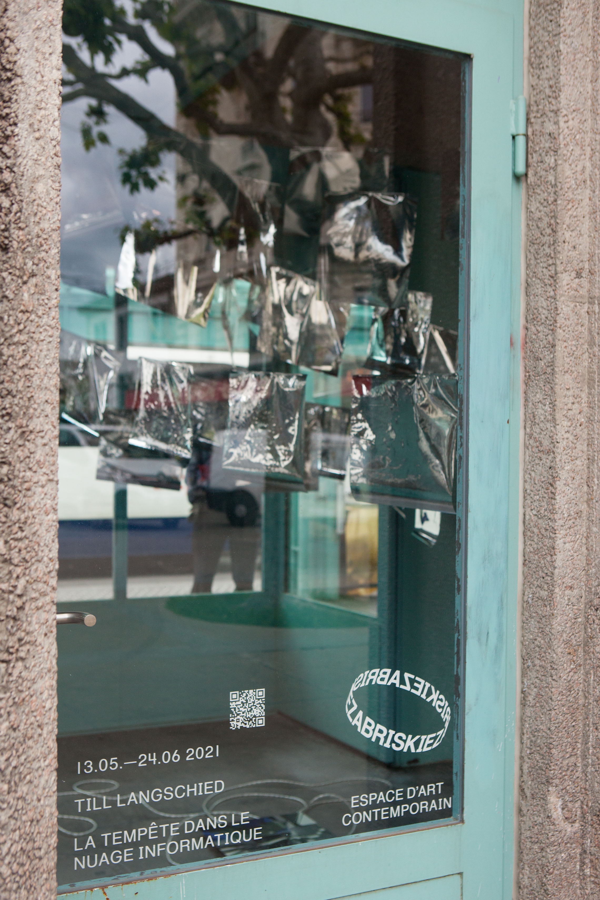 * For his solo exhibition "La tempête dans le nuage informatique" Till Langschied expands the installation of silver flags from his work Datapotheosis (2020) to fill the entire space of Zabriskie Point. The flags are reminiscent of Tibetan prayer flags, which send out blessings when moved by the wind. The artist draws a parallel between this religious function and the quasi-spiritual character of data traffic and uploads into an invisible ‘cloud‘. As such an entangled cloud the flags in the exhibition space can be seen as units in a server farm, enduring a constant storm of electronic impulses rushing through them.